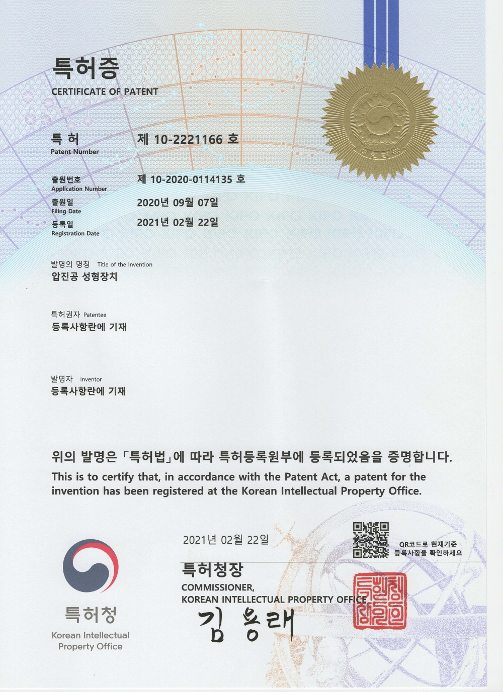 압진공특허증